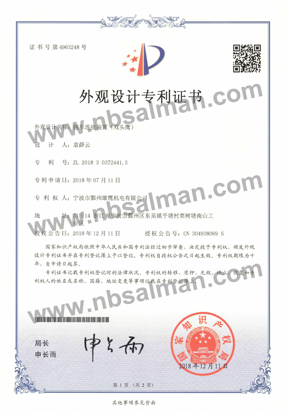 We got two design patents of the products Skull Shape Winch Shackle and Double Heads Eagle Shape Winch Shackle.